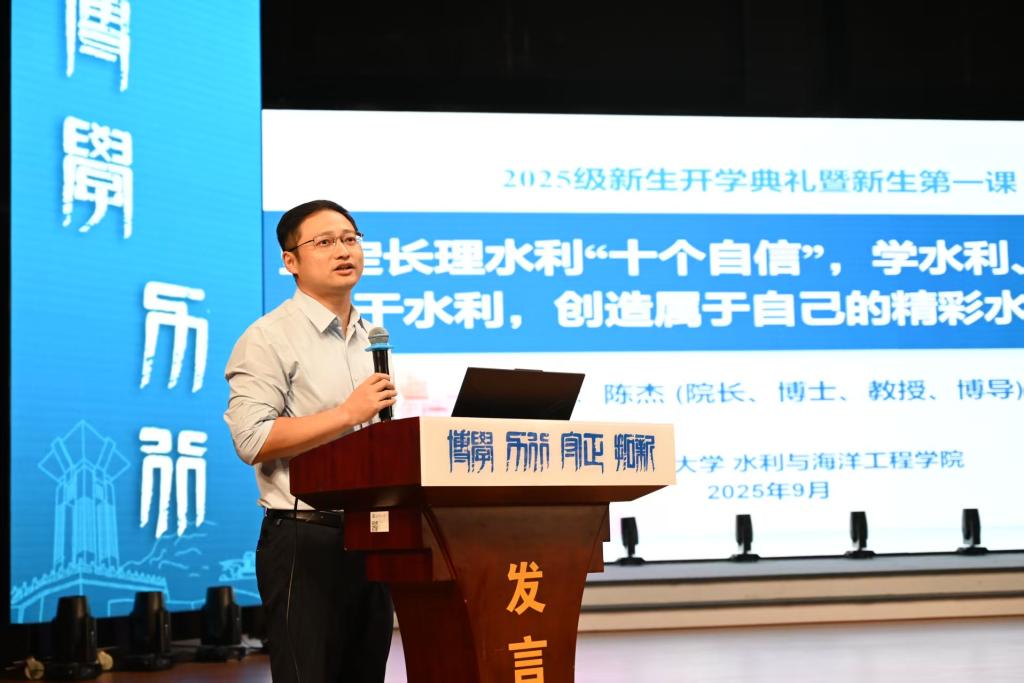 陈杰讲授“坚定长理水利十个自信”新生第一课。通过翔实数据与案例,系统阐释学院在历史底蕴、学科实力、专业特色、人才培养、平台支撑、行业前景等维度的独特优势,寄语新生坚定自信、深植情怀、勇于创新,在新时代水利与海洋事业中书写精彩人生。