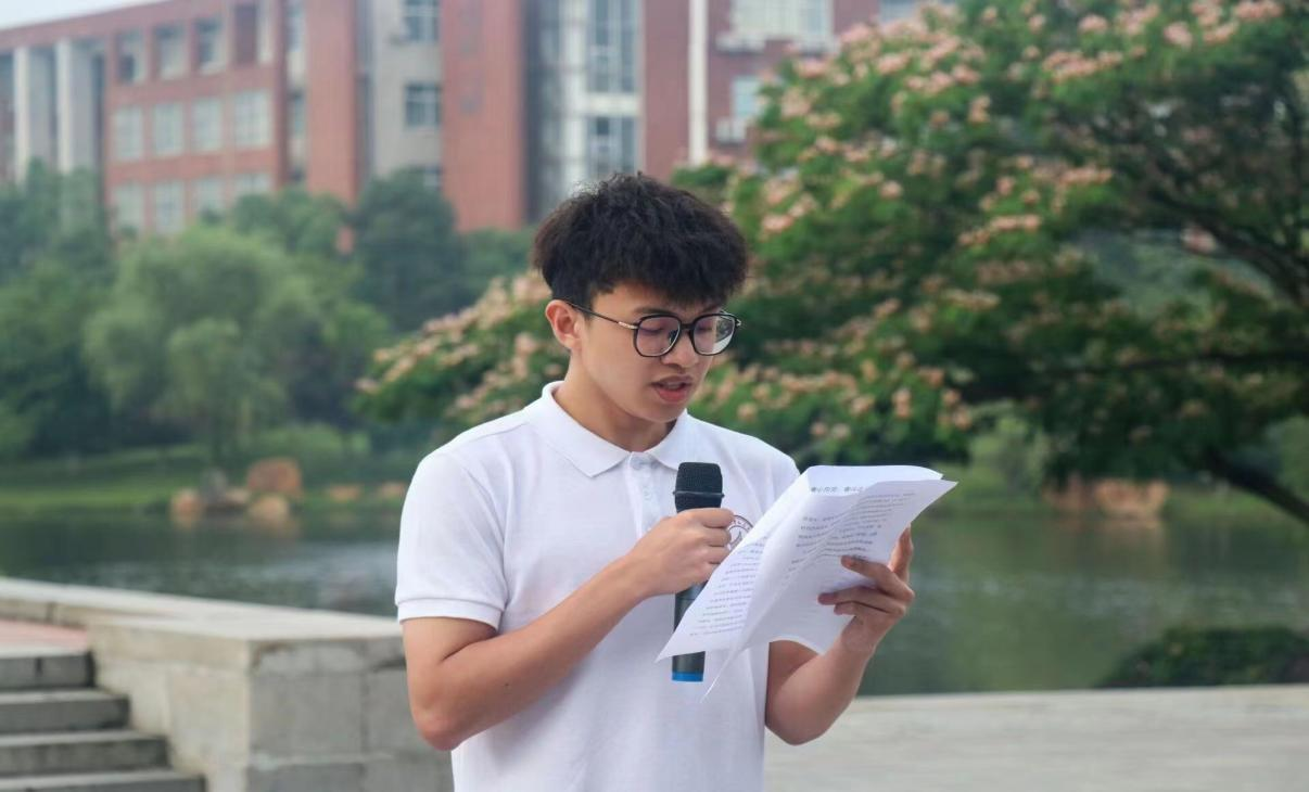 学生代表崔智浩发表国旗下演讲。他讲到:“立足新时代新征程,中国青年的奋斗目标和前行方向归结为一点,就是坚定不移听党话、跟党走,努力成长为堪当民族复兴重任的时代新人”,鼓励同学们尝试放下手机、阅读党史书籍,尝试走出宿舍、躬身社会实践。结合当代学子普遍存在的应付考试、不愿担当等问题,他号召广大同学们树立并坚定理想信念,奋勇进取,努力拼搏,重拾青春该有的活力与朝气,从短期目标逐渐放眼长远理想,以科学的方式追求进步,不忘初心、牢记使命,不负韶华,不负时代,以青春之担当挑起党和人民赋予的历史重任,走好中华民族伟大复兴的新长征路。
