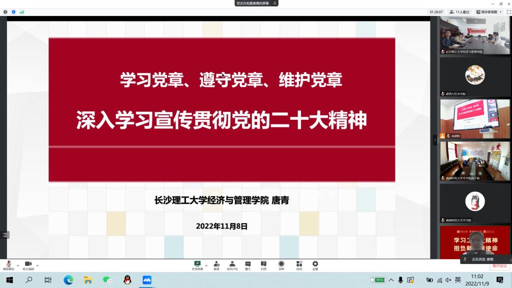 11月9日上午十时,在线买世界杯平台经济与管理学院与中南大学建筑与艺术学院、机电工程学院以及湖南师范大学文学院的辅导员们云相聚,举行“学习党的二十大精神·担负新征程使命”的联合学习交流会。