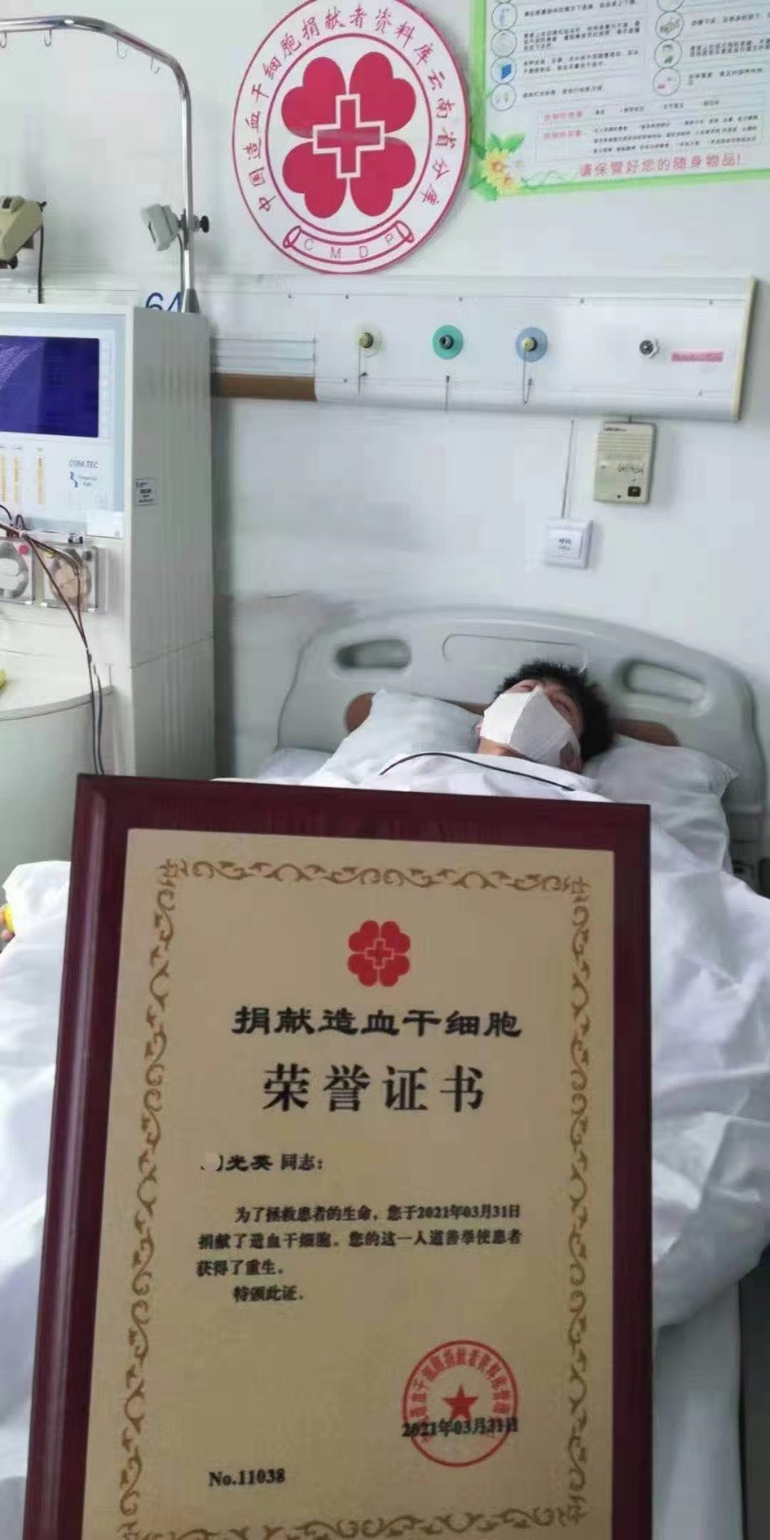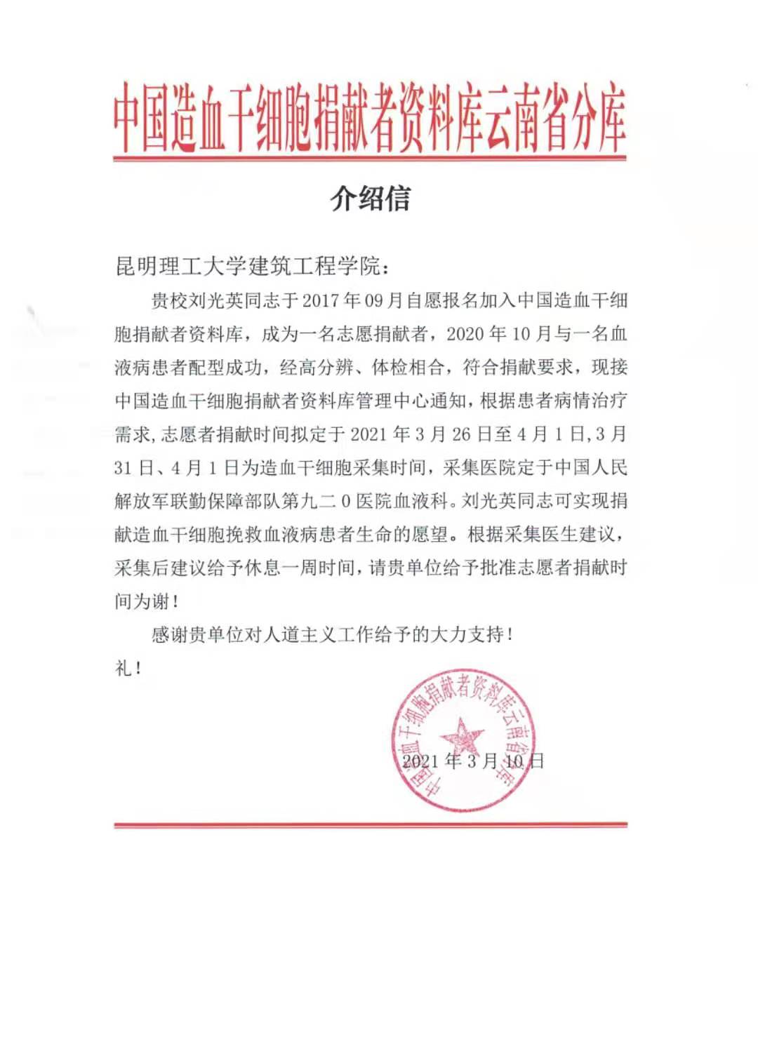 2017年9月,刚刚读大三的刘光英自愿报名加入中国造血干细胞捐献者资料库,成为了一名志愿捐献者,在在线买世界杯平台读书期间一直没有遇到患者配型成功。2020年10月,刘光英到昆明理工大学继续攻读研究生,终于收到了与患者配型成功的消息。当得知配型成功的消息后,刘光英毫不犹豫地答应捐献自己的造血干细胞。