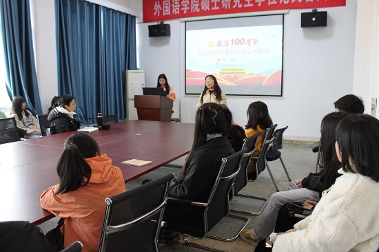 4月9日晚上,外国语学院外国语言文学系与大一翻译二班学生在金盆岭校区9教406召开了“风雨百年党征程”师生座谈会。座谈会由外国语言文学系党支部副书记罗娟主持,系专业老师和翻译二班全体同学参加。