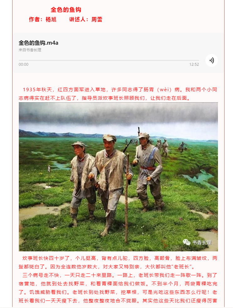 城南学院王志鹏老师生动讲述了周恩来总理《挤车体验》的故事,让听众深深感动于总理从细节入手,严谨、认真的工作作风。校工会副主席彭霞讲述《李先念下连队检查工作自称是通讯员》的故事,清亮干净的嗓音让人禁不住凝神静听。朗诵协会李慧会长深情讲述了《中国共产党第一位女党员——缪伯英》的故事,“我既以身许党,应为党的事业奋斗,直至牺牲。奈何因病行将逝世,未能战死沙场,真是恨事!”让听众不禁落泪。还有文学与新闻传播学院周雷老师讲述的《金色的鱼钩》、外国语学院刘音老师讲述的《陈云对家人实行“三不准”》、研究生院张茂华老师讲述的《手举马灯照万人》……每一个音频故事都承载着历史的厚重,蕴藏着珍贵的“红色记忆”。视死如归的革命烈士、顽强奋斗的英雄人物、忘我奉献的先进模范,在老师们的倾情讲述下变得鲜活起来。