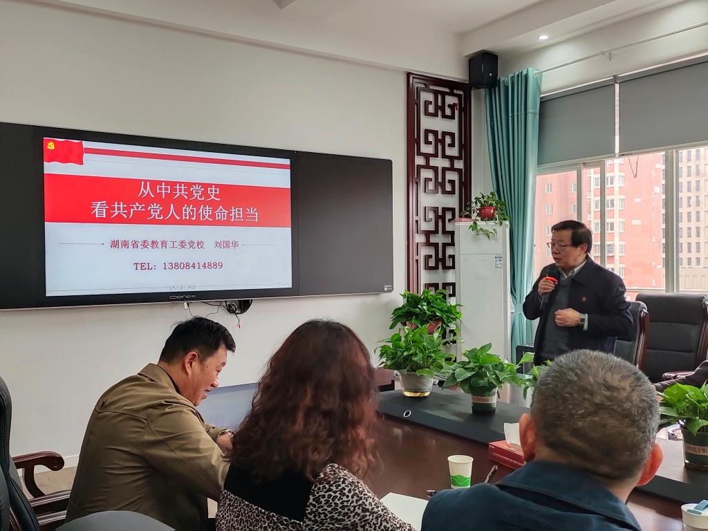 4月19日上午,马克思主义学院党委在云塘校区文科楼B区6楼学院会议室,召开学院党委中心组(扩大)“党史学习教育”专题党课学习。本次学习主题由省委教育工委党校常务副校长刘国华教授主讲,学院副科职及以上干部、工会主席、教授委员全体成员、近4年入职的青年博士参与了本次专题学习,由学院党委书记易显飞主持。