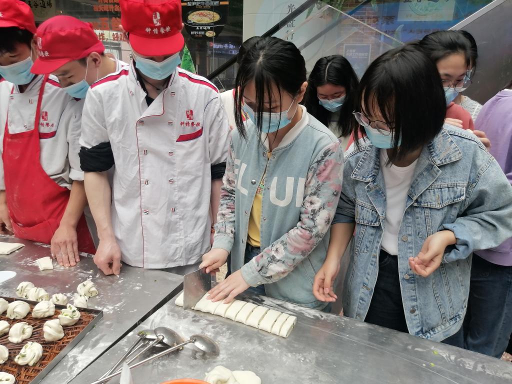 活动中,同学们纷纷围绕在长桌前,专心听师傅讲授制作馒头、花卷、肉包的要领。掌握要领之后一个个跃跃欲试,忙得不亦乐乎。同学们把发好的面团搓成长条,切成一个个小剂子,或捏馒头、或包花卷、或擀包子皮、放肉馅。有的同学动作娴熟、技艺高超,包出形态漂亮的肉包;有的同学别出心裁、包出形状各异的葱卷、肉卷。而第一次学习制作的同学,虚心学习,不断向面点师傅请教,收获新技能。现场气氛热烈,不时迸发出会心的笑声。在大家的共同努力下,近两个小时的时间里,餐盘里就摆满了或大或小,花样繁多,充满创意的馒头、花卷、肉包。