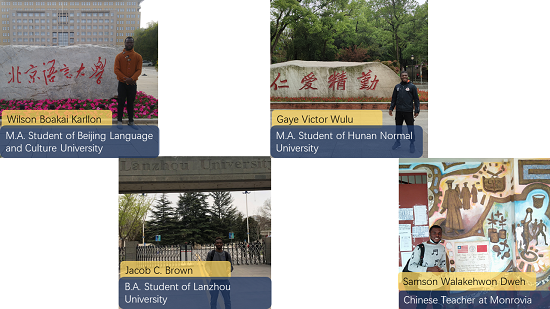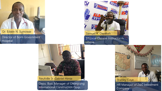 参加访谈的8位孔院学员都是中文学习佼佼者,他们分别是北京语言大学2019级汉语国际教育硕士Wilson Boakai Karllon(博凯)、湖南师范大学2019级汉语国际教育硕士Gaye Victor Wulu(孙胜利)、兰州大学2018级汉语国际教育本科学生Jacob C Brown(王伟)、利比里亚Bomi州政府医院院长Ediwin N. Sumowar(诺尔)医生、重庆外建利比里亚分公司商务部负责人Neufvill Jr. Gabriel Himie(李伟)、在利Z&C中国投资公司人事经理Stanley Gaye(斯坦利)、利大孔子学院第一位本土教师Samuel K Deyekeh(德克)和附属教学点本土汉语志愿者教师Samson Walakehwon Dweh(孙参)。