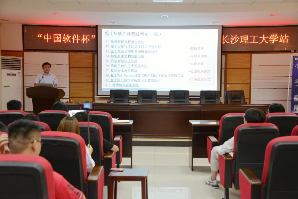 5月8日晚,由工业和信息化部、教育部和江苏省人民政府共同举办的第十届“中国软件杯”大学生软件设计大赛长沙站巡讲在在线买世界杯平台计通学院举行。学院副院长王威、大赛组委会代表老师卢秀娜,大赛评审委员会专家王升辉、中国移动云能力中心人工智能专家吴秦龙、产品专家张璐出席本次活动并讲话。