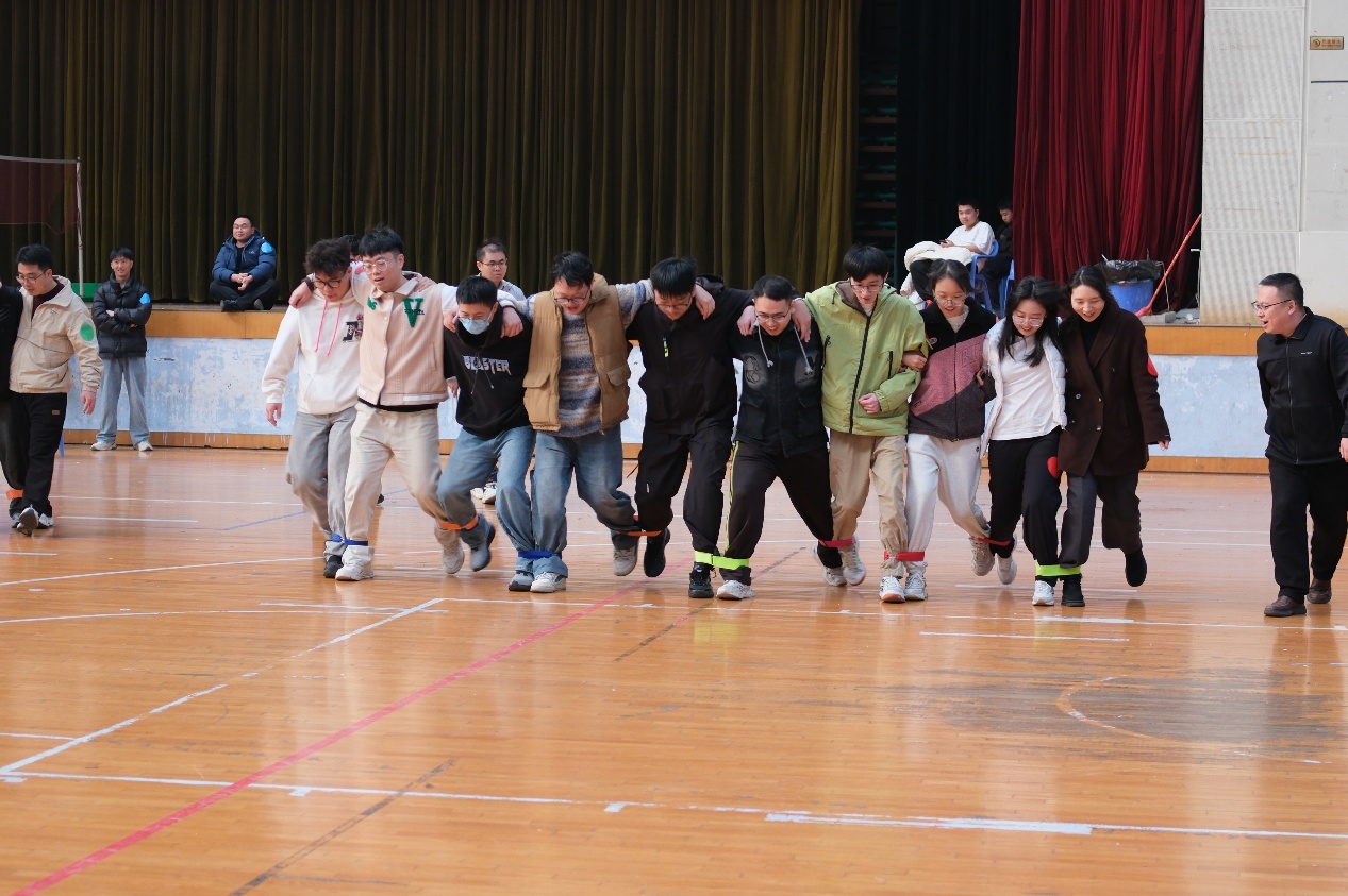 随着比赛正式开始,师生随机组成六支队伍展开角逐。运动会设置四个集体项目,兼顾个人技能与团队协作。“十人十一足”游戏中,队员们肩并肩、腿绑腿,喊着整齐的口号迈向终点,步伐从凌乱到统一的过程生动诠释了团队磨合与信任建立。“珠传万里”则要求队员们利用U型槽接力传递小球,每一次小心翼翼的传递和接应都是耐心与精准配合的体现。“夹波珠”项目聚焦手眼协调与心态稳定,现场不时响起鼓励的掌声。压轴项目“拔河”将现场气氛推向高潮,绳索两端的师生们重心后压、齐心协力,现场观众的呐喊助威声震彻场馆,凝聚力和团队精神充分彰显。