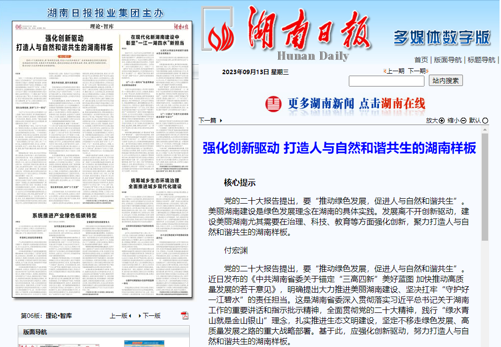 湖南日报:付宏渊:强化创新驱动 打造人与自然和谐共生的湖南样板