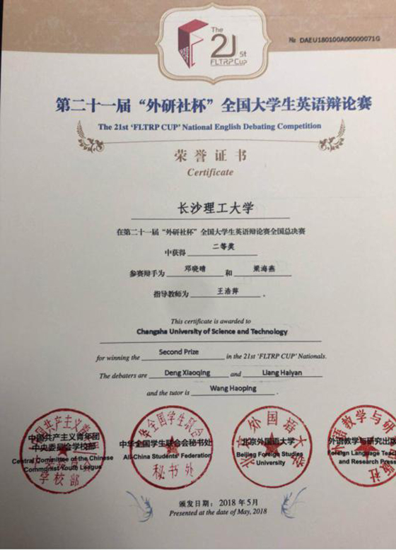 世界杯官网代表队在第二十一届“外研社杯”全国大学生英语辩论赛喜获全国二等奖