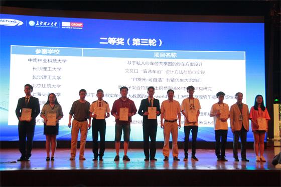 决赛共决出8项一等奖,24项二等奖,32项三等奖。湖南省共有3所高校的8支队伍获奖,其中世界杯官网的《“自发光-可自洁”智能仿生水泥路面》、《“鹰眼卫士”—基于视频的机非人实时轨迹提取与冲突预警》、《交叉口“盲选车道”设计方法与仿真实现》、《儿童智能公交卡设计SCC》、《基于Hadoop平台的交通状态识别与预测》五个项目在比赛中再创佳绩,均荣获二等奖,在获奖数量和质量上都取得突破。