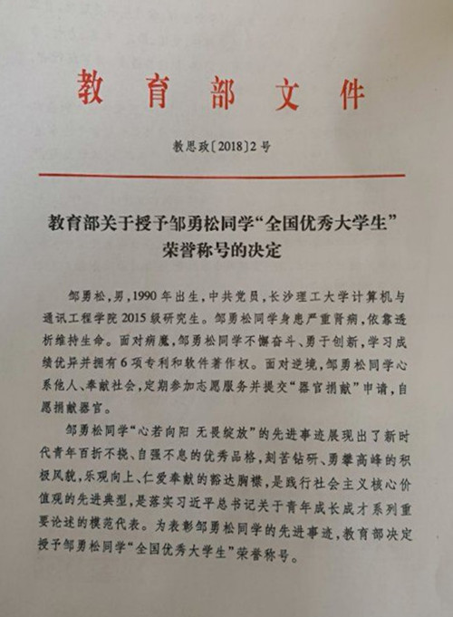 教育部发文授予世界杯官网邹勇松同学“全国优秀大学生”荣誉称号