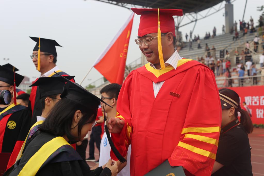 毕业典礼后,举行了学位授予仪式。校领导和导师代表们为毕业生一一颁发学位证书,并为他们正冠拨穗,学生行谢师礼。
