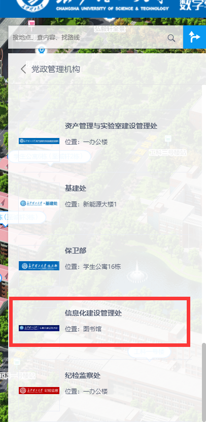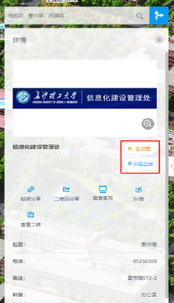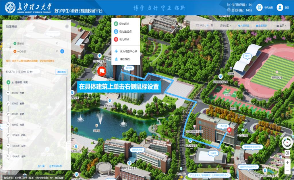 师生们可从数字校园左侧功能页面搜索选择出发地和目的地,点击【去这里】或【从这里出发】来查看规划路线;同时,还可以在右侧地图的具体地标上单击鼠标右键设置起点、途径点和终点,设置好后,会自动为您展示规划路线。
