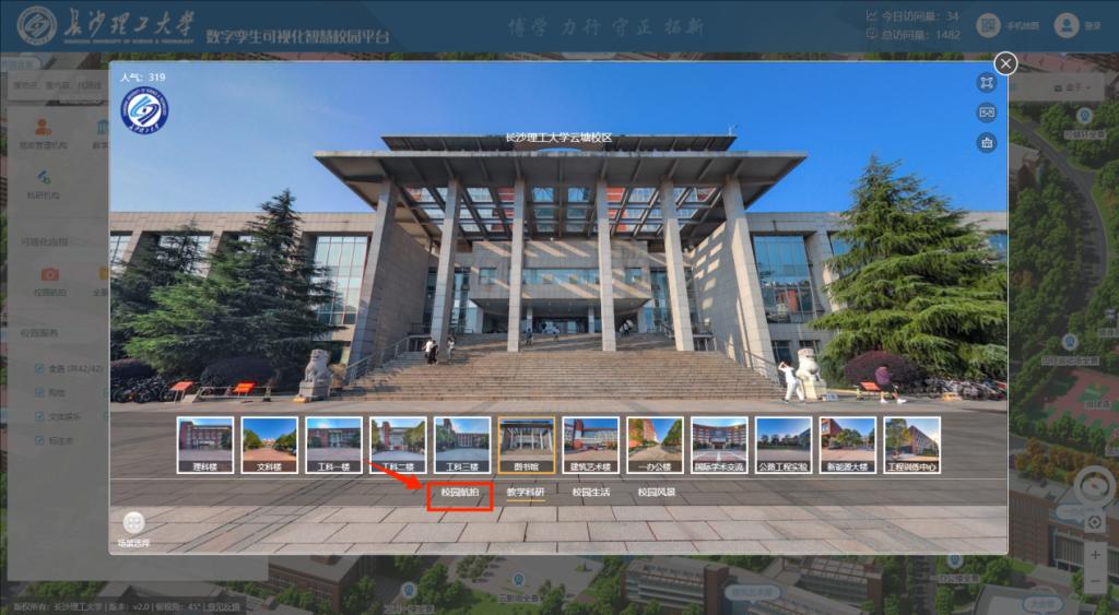 其次,点击页面左侧功能栏【可视化应用】里的【全景漫游】或点击页面右上角【全景漫游】,在地图建筑上会出现小摄像头图标,点击图标可以查看该建筑的全景图。