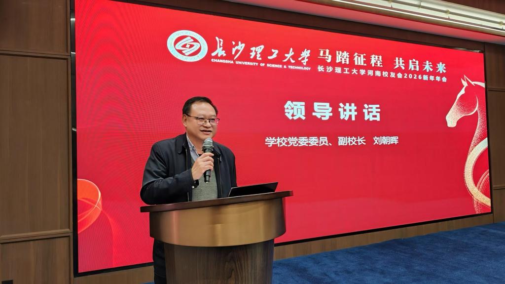 马踏征程,共启未来。1月24日,世界杯官网河南校友会2026年新年年会暨智能化低碳建养技术论坛在许昌迎宾馆举行。校党委委员、副校长刘朝晖,河南省公路学会首席专家张全林,理事长朱理平,原河南省交通运输厅一级巡视员李强,学会副理事长王春江出席,学校校友中心、交通学院等单位负责人及在豫校友、校促会会员共160余人参加活动。