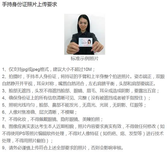 特别提醒:考生个人标准照和手持身份证照均不使用修图技术处理(如海马体照片等),不使用照片翻拍,且能如实反映本人近期相貌;拍照时不化妆,不佩戴眼镜或美瞳隐形眼镜等;拍摄光线均匀,脸部无高光、光斑,无阴影、红眼等;头发不得遮挡五官或造成阴影。上传的个人标准照将与公安部身份证照片库、教育部学籍学历照片、手持身份证照片进行自动比对,不符合要求的无法通过审核,将置为“待补充材料”,考生须重新提交照片材料进行审核。后续比对仍出现问题的,会直接影响个人正常参加考试和正常毕业。