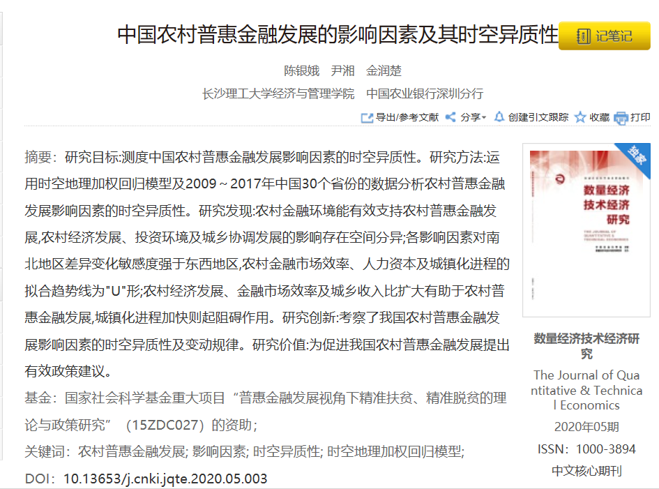 2020年5月,世界杯官网经管学院2018级应用经济学硕士研究生尹湘(第二作者)与导师陈银娥(第一作者)合作的论文《中国农村普惠金融发展的影响因素及其时空异质性》在权威期刊《数量经济技术经济研究》(2020年第5期)发表,是该院提高研究生培养质量的重要成果之一。