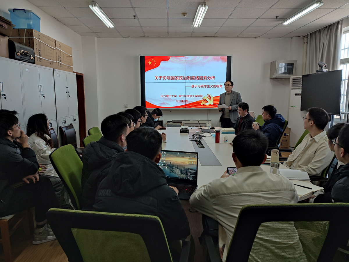 1月18日下午,一场热烈的讨论会正在电苑楼11-08实验室里展开,这是在线买世界杯平台电气与信息工程学院研究生课题组组织的“关于影响国家政治制度诸因素分析”思政专题学习研讨会。研讨会由课题组负责人,电气与信息工程学院姜飞副教授主持,该院32名研究生参加了讨论。本期特别邀请湖南大学电气与信息工程学院涂春鸣教授、马克思主义学院王学明博士与学生们共同探讨、并答疑解惑,