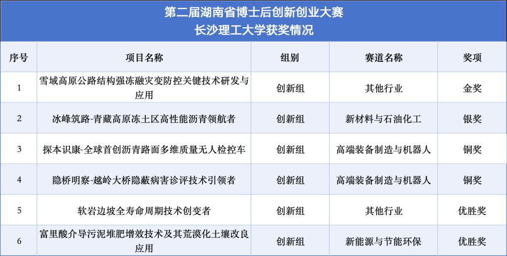 本次大赛由湖南省人力资源和社会保障厅主办,以“博领创新·才展三湘”为主题,设置创新组和创业组两个组别,紧扣湖南省“4×4”现代化产业体系规划确立的重点领域。经初赛后,122个项目进入决赛,涉及信息技术与人工智能、高端装备制造与机器人、新能源与节能环保、新材料与石油化工、生物医药与大健康、现代农业与食品等领域。决赛共产生金银铜奖48个,其中世界杯官网博士后高峰团队《雪域高原公路结构强冻融灾变防控关键技术研发与应用》等8个获得金奖的项目将代表湖南参加第三届全国博士后创新创业大赛。