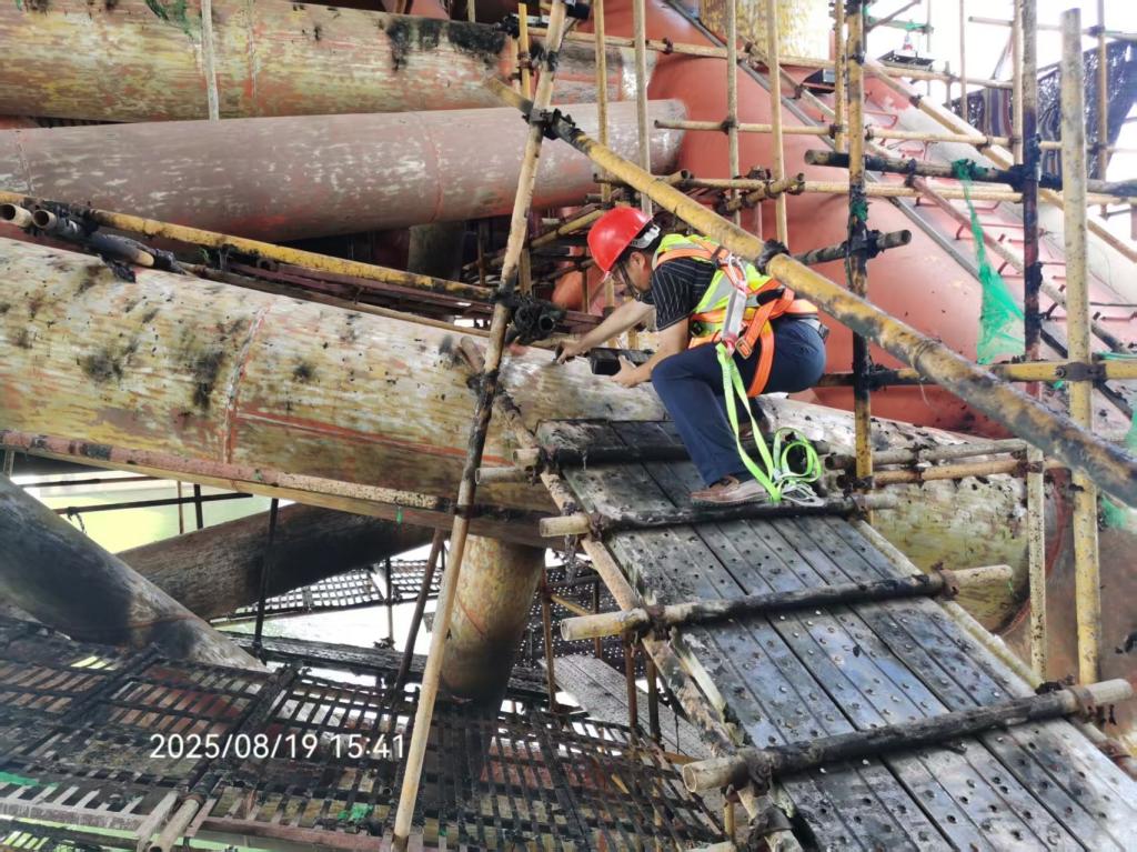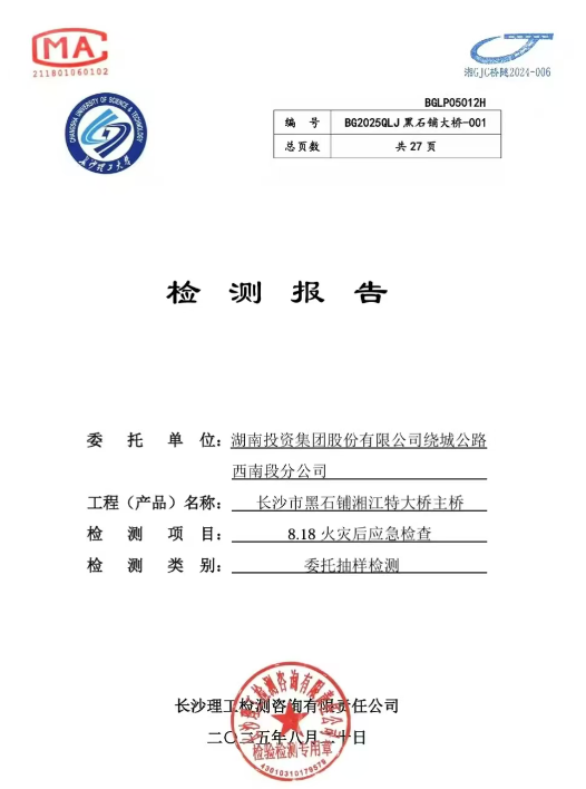 2025年8月18日18时43分,G0401长沙绕城高速西南段K51黑石铺湘江特大桥桥下施工区域,因防尘土工布燃烧引发火情。该桥2004年4月建成通车,至今已安全运营21年。火情发生后,桥梁安全成为公众关注的焦点,桥梁管理单位第一时间委托长沙理工检测咨询有限责任公司对桥梁进行安全检测。学科核心支撑学院(土木与环境工程学院)王中强老师主导完成了对黑石铺湘江特大桥主桥的火情现场调查、吊杆索力、拱肋变形及桥面线形测试,出具了《长沙市黑石铺湘江特大桥主桥8·18火灾后应急检查报告》。