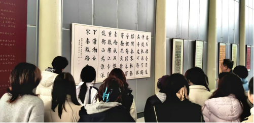走进展厅,一幅幅笔力遒劲、气韵生动的楷书作品令同学们驻足流连。这些作品既有唐楷的法度森严,又有魏碑的古拙雄强,更不乏当代书家个性化的艺术探索。同学们在墨香中感受书法艺术的独特魅力。“这些字写得太精神了,原来楷书可以这么丰富,既有传统韵味,又有现代审美。”一位同学在现场感慨道。