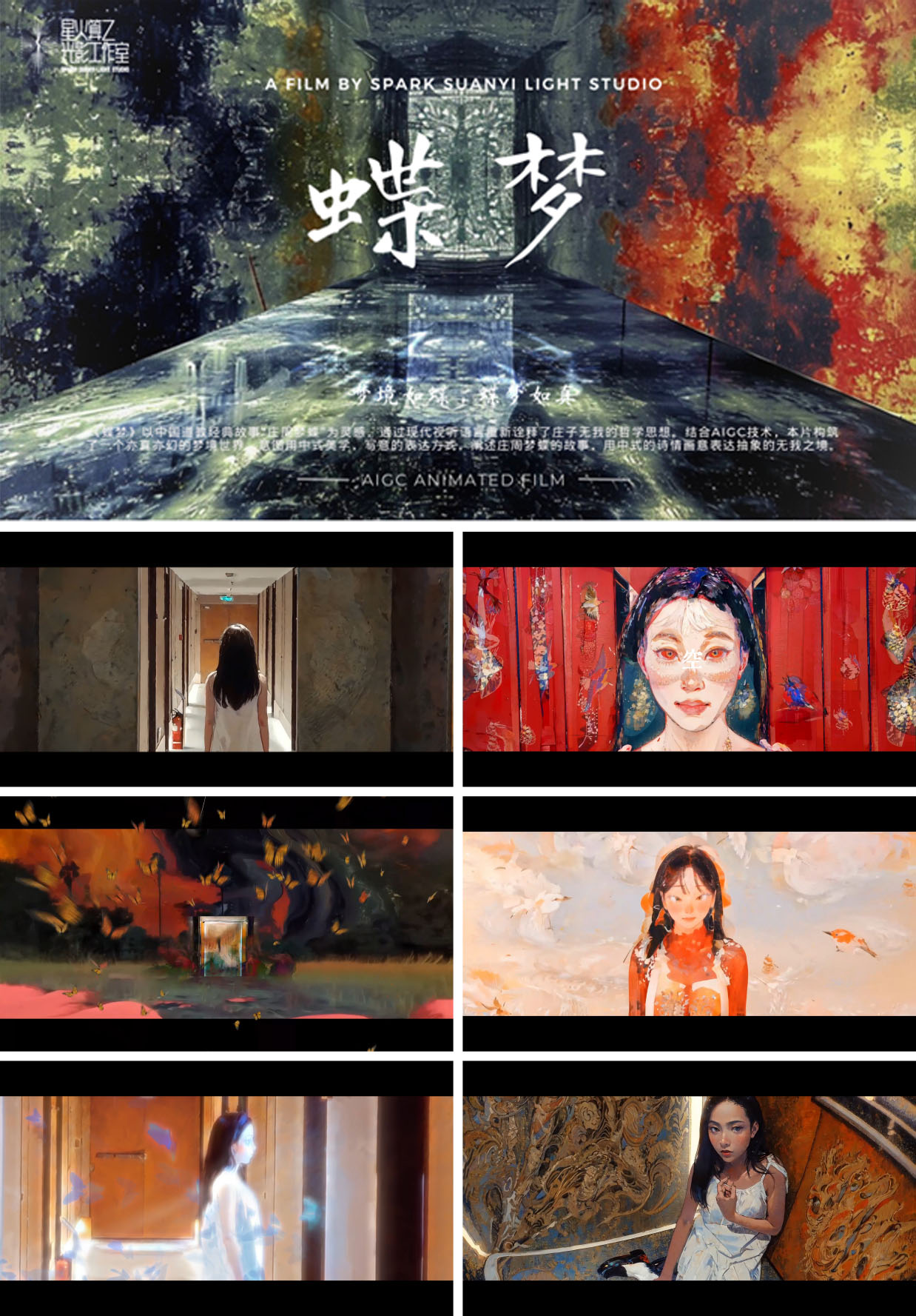 我院师生作品《蝶梦》以中国道教经典故事“庄周梦蝶”为灵感,通过现代视听语言重新诠释了庄子无我的哲学思想。影片结合AIGC技术,构建了一个亦真亦幻的梦境世界,用中式美学和写意的表达方式,讲述庄周梦蝶的故事,诗意的传达了庄子“无我”的哲学境界。