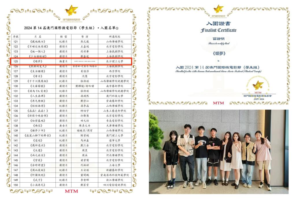 近日,2024第十四届“澳门国际微电影节”入围名单正式揭晓,我院师生团队共同创作的作品《蝶梦》成功入围。