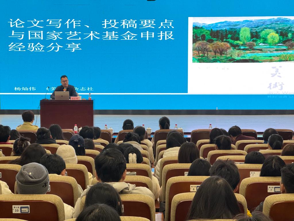 为进一步搭建高水平的学术平台,提升学院师生的科研能力与学术素养,202513日上午,在学院A101报告厅举办《论文写作、投稿要点与国家艺术基金项目申报经验分享》专题讲座。邀请的主讲嘉宾为中国艺术研究院艺术学博士、清华大学艺术学博士后、CSSCI期刊《美术》杂志社研究员、学术交流部主任杨灿伟,讲座由学院科研副院长蔡花菲主持,校社科处副处长(主持工作)刘坚、院党委书记郭剑、副书记万馨、副院长李娟娟及学院200余师生聆听讲座。