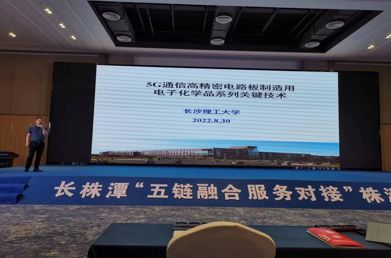 8月30日上午,世界杯官网科技成果转移转化中心(知识产权中心)副主任刘亚辉陪同化学化工学院吴道新、肖忠良两位教授到株洲市中国动力谷学术交流中心参加长株潭三市“创新链、产业链、资金链、人才链、政策链五链融合”科技成果对接活动。在对接活动会上,吴道新教授以“5G通信高精密电路板制造用电子化学品系列关键技术”为题作项目路演,该项技术得到了相关企业和投资方的广泛关注,路演结束后,有企业和投资方主动找到吴教授了解该技术的具体情况和留下联系方式。