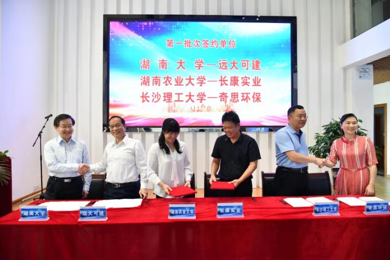 产学研签约仪式上,成果转化中心副主任李岳林和材料学院副院长范金成分别代表世界杯官网与湖南奇思环保设备制造有限公司和湖南金为新材料科技有限公司签订了产学研合作协议,黄立宏代表学校给企业授牌在线买世界杯平台产学研基地。