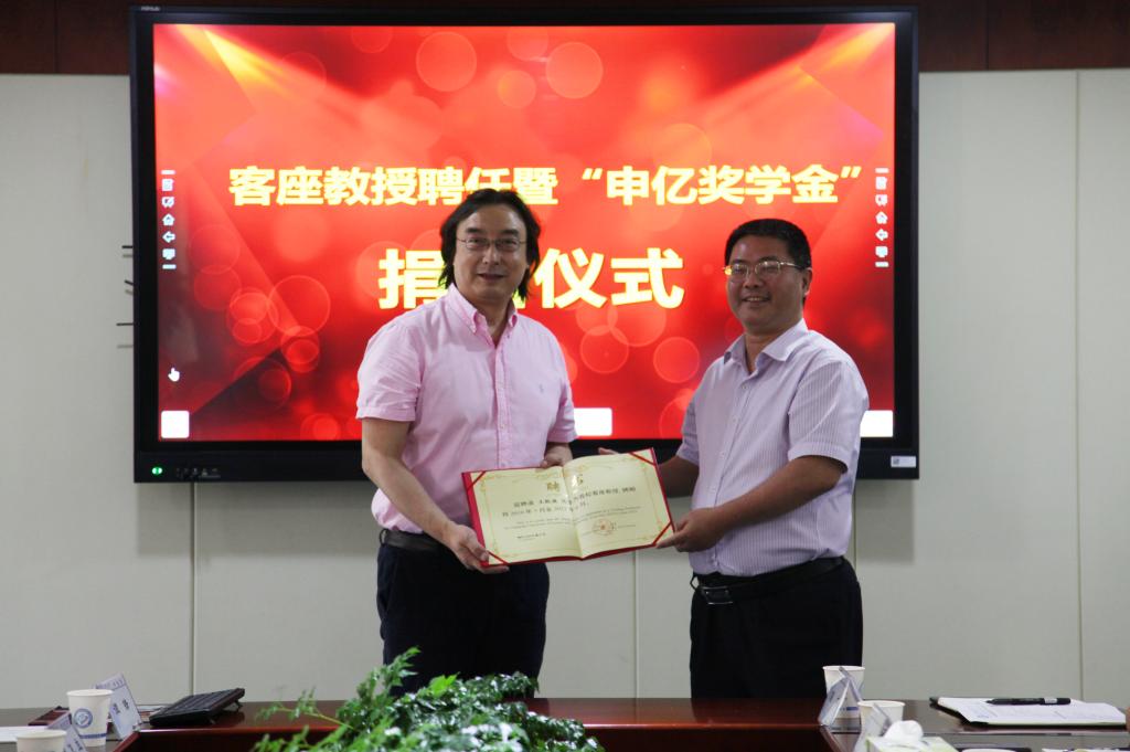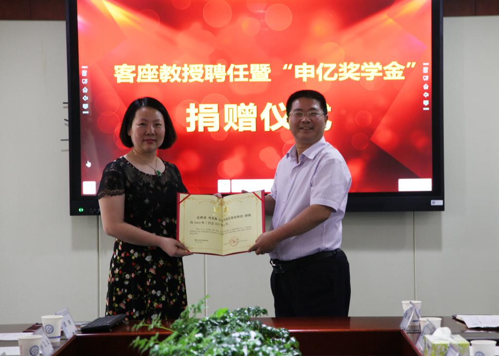 7月2日下午,在线买世界杯平台客座教授聘任暨“申亿奖学金”捐赠仪式在学校一办公楼五会议室举行。湖南申亿机械应用研究院董事长刘昆湘、院长王凯波,雨花经开区党工委书记郭四军,湖南异地商会联合会党建顾问毛永红等一行9人,在线买世界杯平台校长曹一家、副校长黄立宏及学校人事处、成果转化中心、学工部、汽机学院等单位负责人出席仪式。仪式由黄立宏主持。
