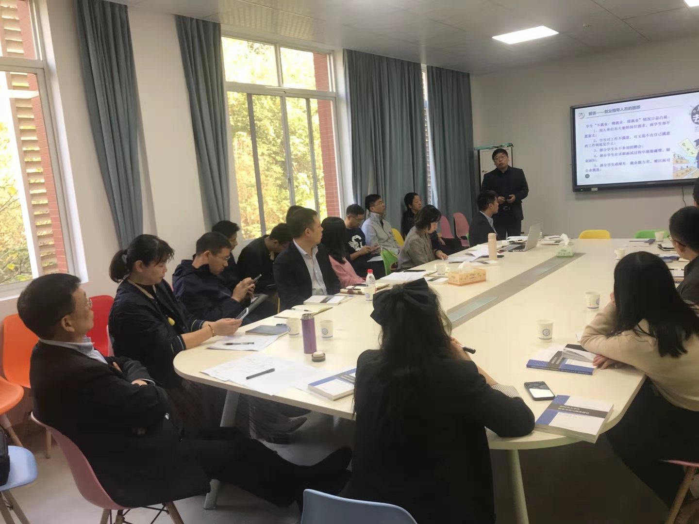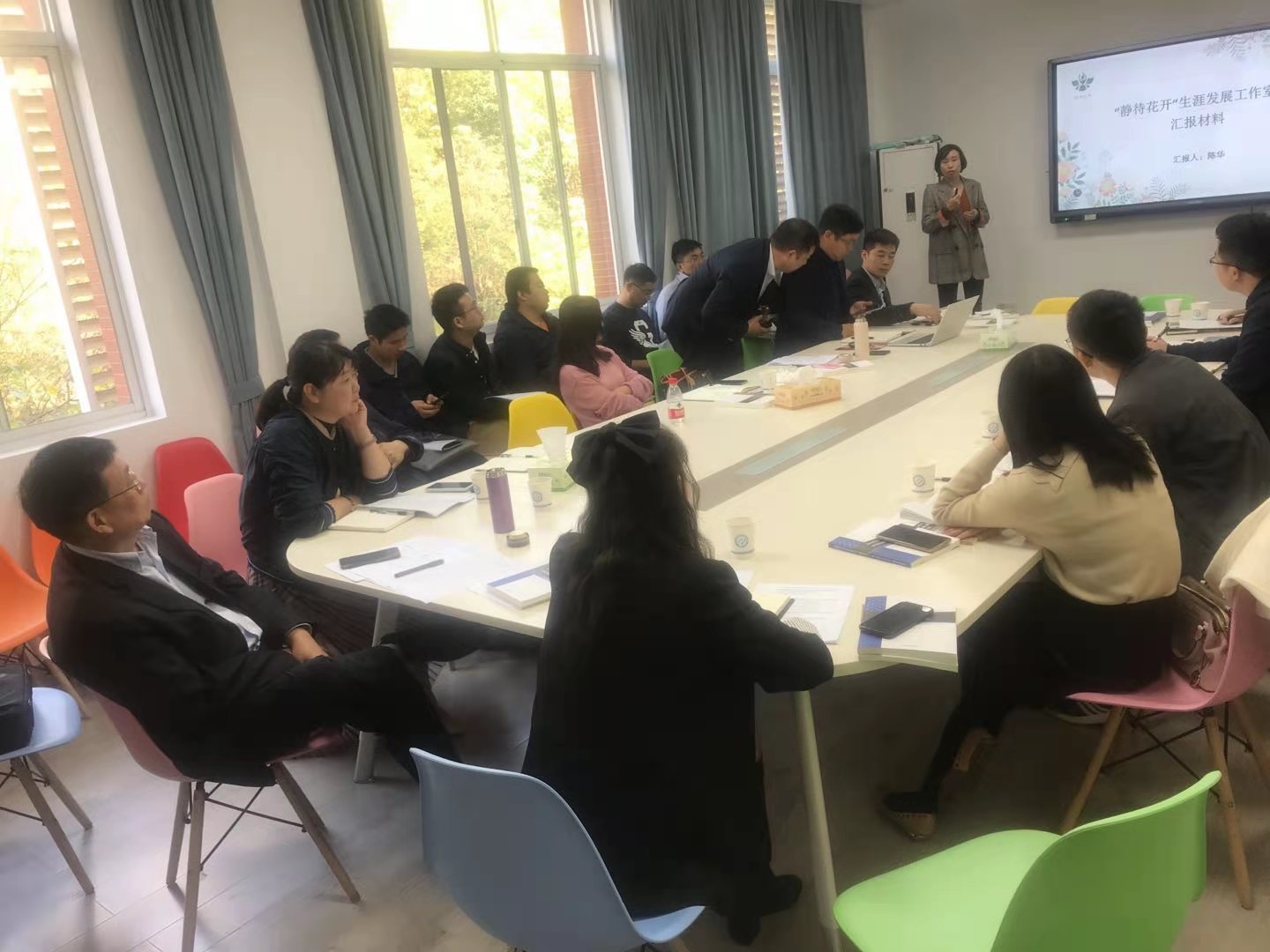 靳攀科提出我们要做有温度的教育,并从理论与实践两个层面对什么是有温度的教育、有温度的教育应该怎么做进行了阐述。陈华对“静待花开”生涯发展工作室从成立初衷、定位、团队建设、运营情况四个方面进行总结汇报。李娜从校企导师制的意义、探索、作用等方面探讨企业参与大学生职业发展教育的重要性以及导师制的搭建与实施。