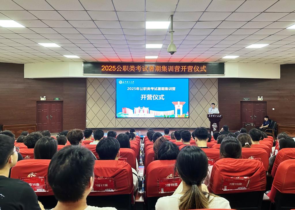 7月12日,世界杯官网2025年公职类考试暑期集训营开营仪式在云塘校区文科楼报告厅举行。学校创业就业指导处处长田上、创业就业指导处蔡翔羽老师、水利学院2020届校友夏建杰、交通学院2021届校友贺治宇、机械学院2023届校友孙泽文、文新学院2024届校友周旺、教师代表李艳春、梁力丹以及全体集训营学员参与活动。