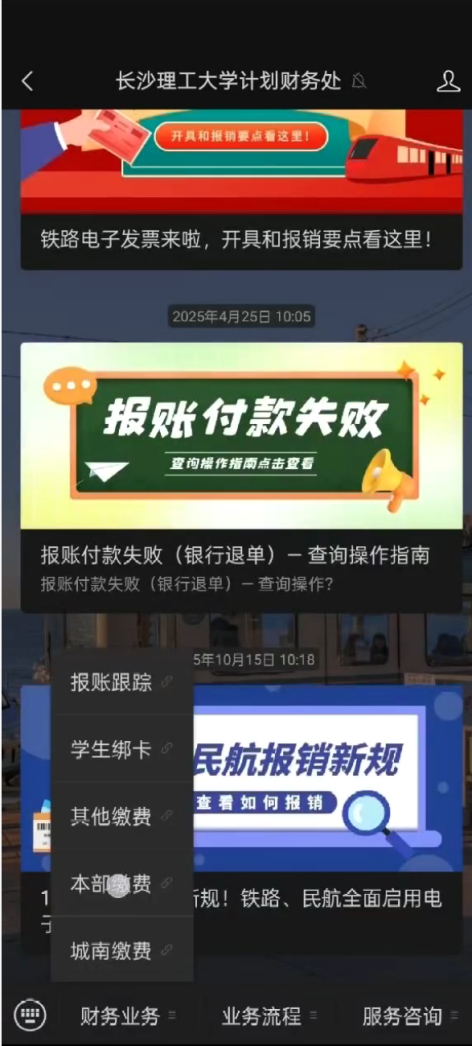一、关注“在线买世界杯平台计划财务处”公众号,在左下角“财务业务”处,找到“本部缴费”