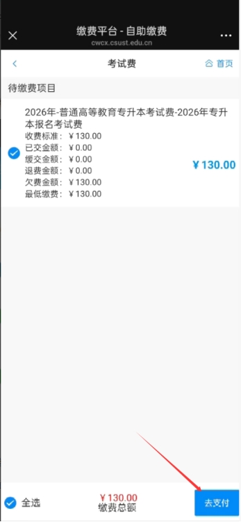 三、选择“考试费”后将显示待缴费项目,核对无误后点击右下角“去支付”